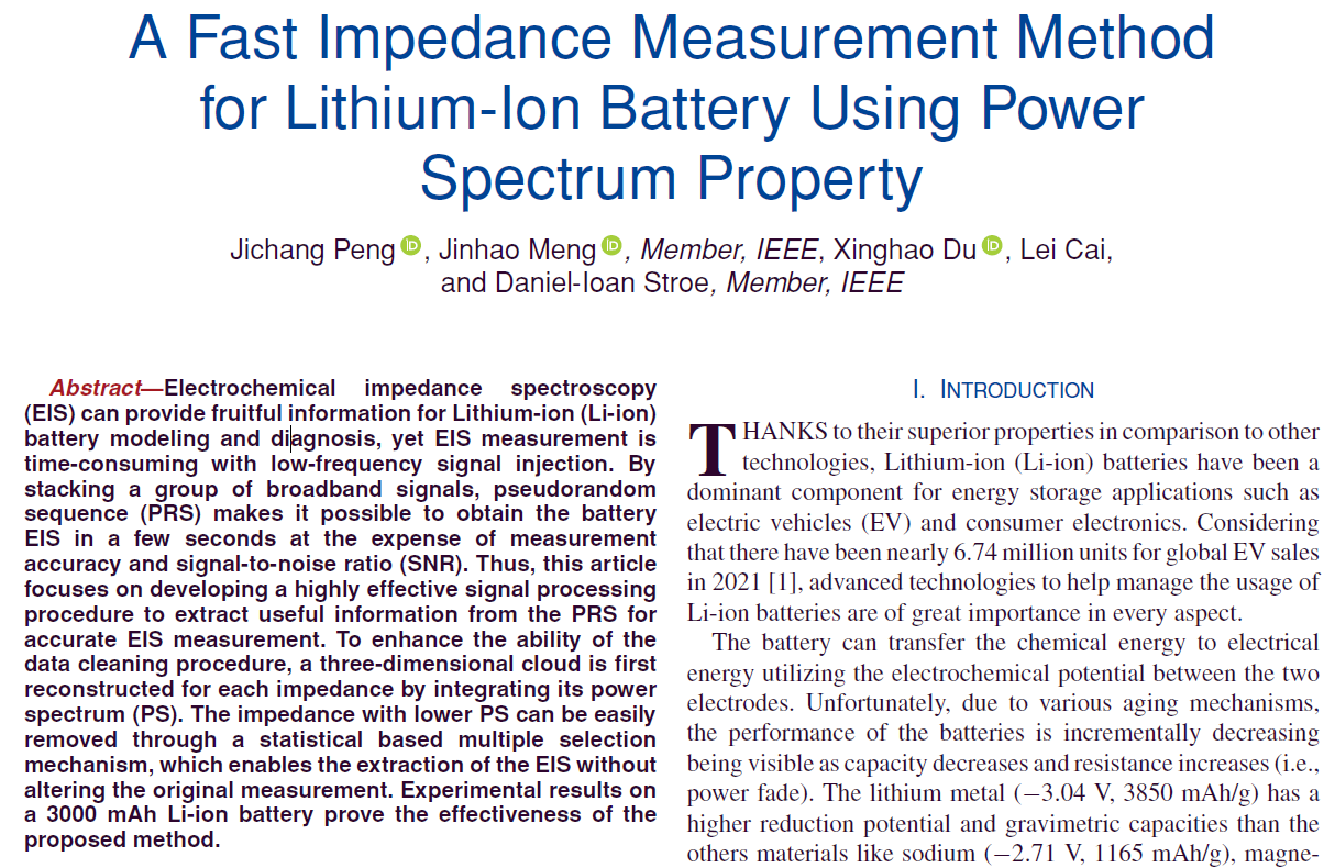 近日,我校智能电网产业技术研究院先进储能技术与应用科研团队在储能锂电池健康状态估计研究领域取得新进展,相关研究成果“A Fast Impedance Measurement Method for Lithium-Ion Battery Using Power Spectrum Property”在电气工程领域的TOP期刊《IEEE Transactions on Industrial Informatics》上发表,我校彭纪昌老师为第一作者,四川大学孟锦豪副教授为通讯作者,四川大学杜星皓、西安理工大学蔡磊、奥尔堡大学Daniel-Ioan Stroe为合作者。