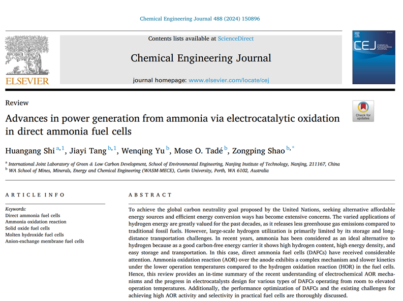 近日,我校环境凯发时焕岗教授以第一作者,凯发k8官网为第一署名单位,与澳大利亚科廷大学邵宗平教授课题组深度合作,在国际权威期刊《Chemical Engineering Journal》在线发表最新综述论文:Advances in power generation from ammonia via electrocatalytic oxidation in direct ammonia fuel cells。《Chemical Engineering Journal》是中科院一区TOP期刊,主要报道工程领域化学反应工程、环境化学工程及材料合成应用等方面重要的科学研究成果和创新技术,影响因子15.1。
