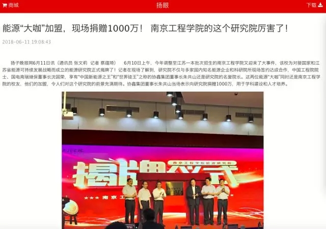 在成立大会现场,研究院与协鑫集团有限公司、中国能源建设集团江苏省电力设计院有限公司、国电南京自动化有限公司、中国华能集团公司江苏分公司、国家电投江苏电力有限公司、华润电力控股有限公司江苏大区、南京汽轮电机(集团)有限责任公司、新疆金风科技股份有限公司等8家企业和科研院所签约,建立合作。协鑫集团董事长、研究院名誉院长朱共山是南工程校友,在发言中他当场表态,向母校捐赠1000万用于学科建设和人才培养。朱共山告诉记者,协鑫集团是以新能源、清洁能源产业为主,相关产业多元化发展的综合能源服务商,到2017年底,协鑫新能源的光伏电站装机总量突破600万千瓦,居全球第二。协鑫一直致力于以绿色发展引领能源行业变革,希望在分布式能源、微网、储能、智慧城市等领域有更大的作为,在能源大数据平台、能源智能互通方面有更多的创新。协鑫一向十分重视与高校的合作,他相信与南工程的合作将进一步推进企业的科技创新、转型升级和绿色发展,为生态环境发展作出新贡献,“让人们看得见青山,记得住乡愁。”