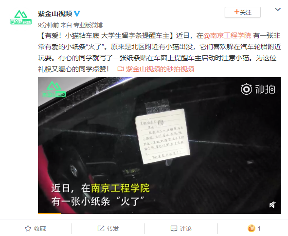 《紫金山视频》:有爱!小猫钻车底 大学生留字条提醒车主