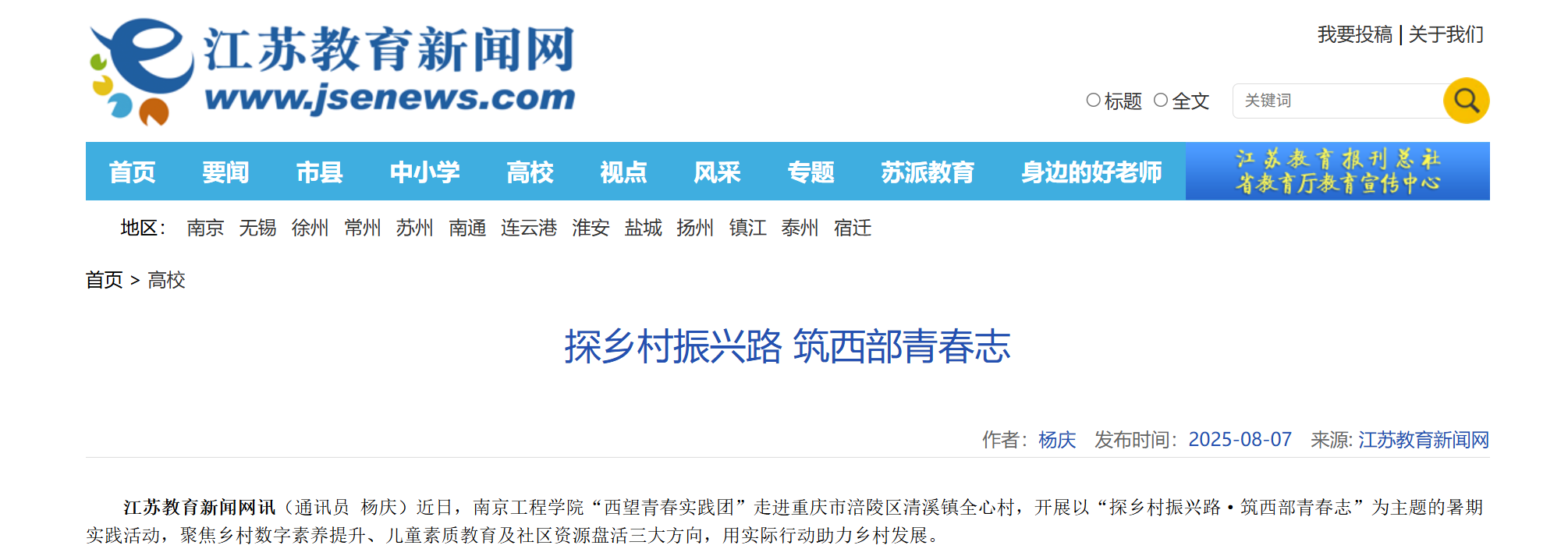《江苏教育新闻网》:探乡村振兴路 筑西部青春志