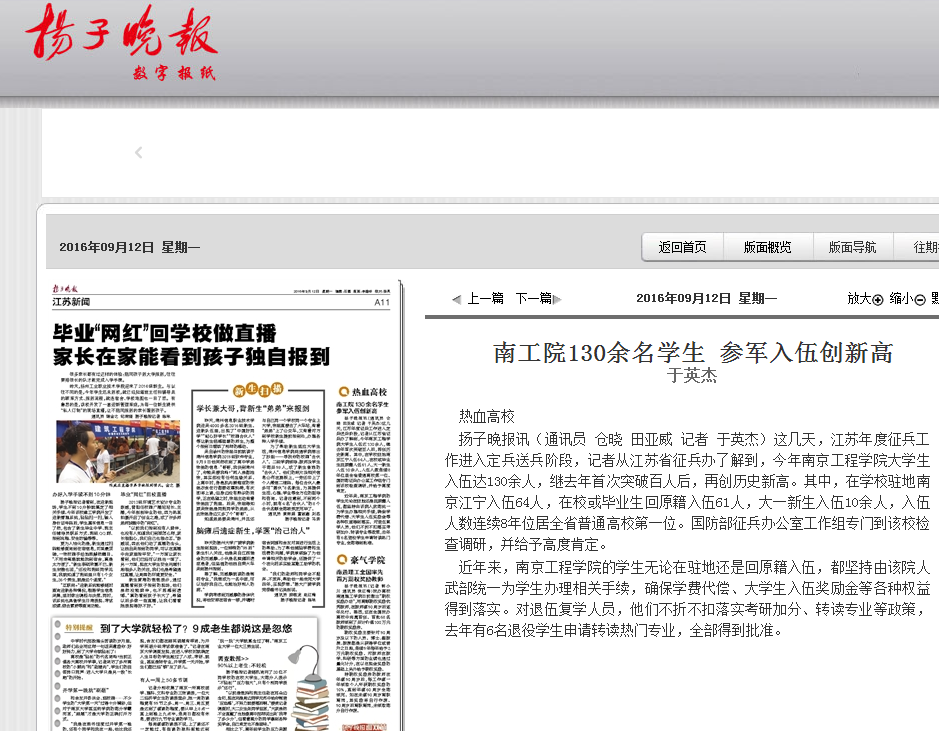 上一篇: 《现代快报》:江苏最热血高校140多名大学生参军 连续8年入伍最多