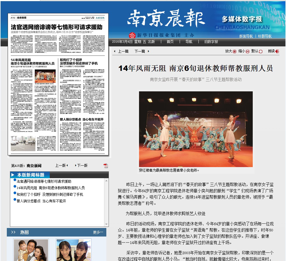 《南京晨报》:14年风雨无阻 南京6旬退休教师帮教服刑人员