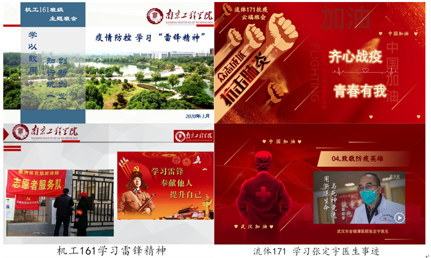 此外,各班级结合专业特色和年级特点,紧扣时事热点,丰富了班会的主题内容。机工161结合对疫情防控的学习和刚刚过去不久的“雷锋日”,深入学习“雷锋精神”和疫情中展现的志愿者精神的传承关系。流体171集中学习了武汉金银潭医院张定宇院长的感人事迹,他用渐冻的生命与死神竞速,堪称“医者仁心”的典范。机电182聚焦同学们的身心健康,开展了疫情期间的心理健康调查,呼吁大家学会调节压力、接纳负面情绪,用积极的心态应对生活中的变化。多样的主题充分激发了同学们的参与热情,体现科学性、教育性和创新性。