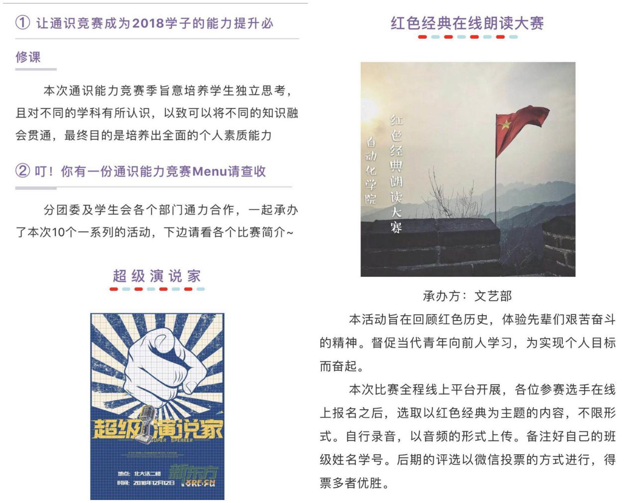 本次通识能力竞赛季活动为自动化学院学子提供了“菜单式”的微竞赛选单,为学院学子提供多样化、可自主选择的竞赛类型。通识能力系列微竞赛选单主要围绕人文阅读、摄影绘画、主题演讲、科技知识、党团知识、学习能力、心理健康等方面综合设计,其中具体包含“阅读书评竞赛”、超级演说家、拾光绘画摄影大赛、电子知识竞赛、党团知识竞赛、宿舍美化竞赛、心理知识竞赛、红色经典朗读竞赛、最美学霸笔记Show、PPT制作与美化大赛。本次通识能力竞赛季以线上报名为主要形式,要求学院全体学生依据自身能力特点及兴趣自主选择一个或多个竞赛类型,做到人人参与、以生为本、类型多样。