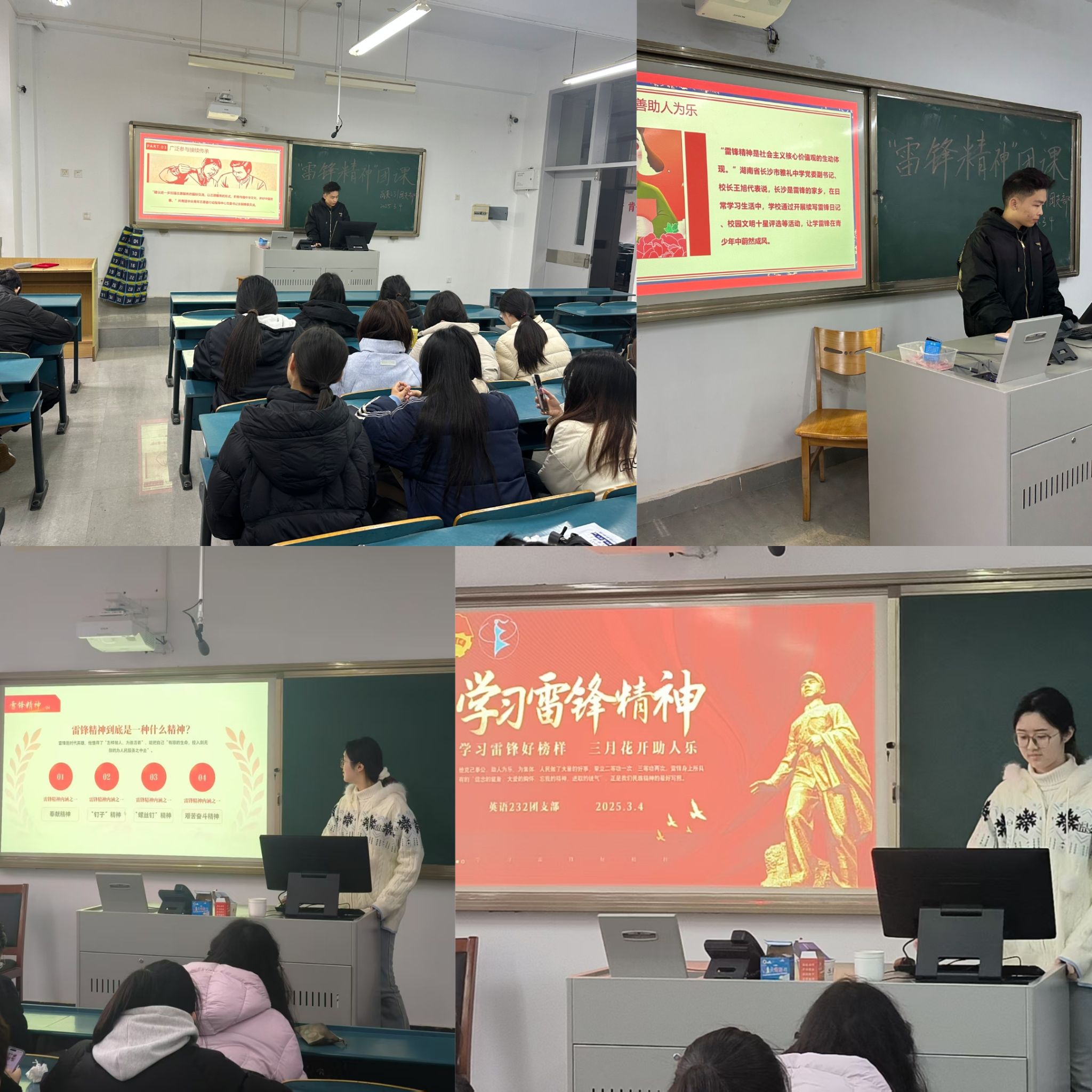 汲取榜样力量,主题团课强信念。学院各班级开展“学雷锋精神,做追‘锋’青年”主题团课,商英231团支书通过理论学习、纪录片观影、分组交流等形式,带领同学重温“钉子精神”等经典故事,同学们表示会将雷锋精神融入到日常,从身边的小事做起,用实际行动诠释雷锋精神。