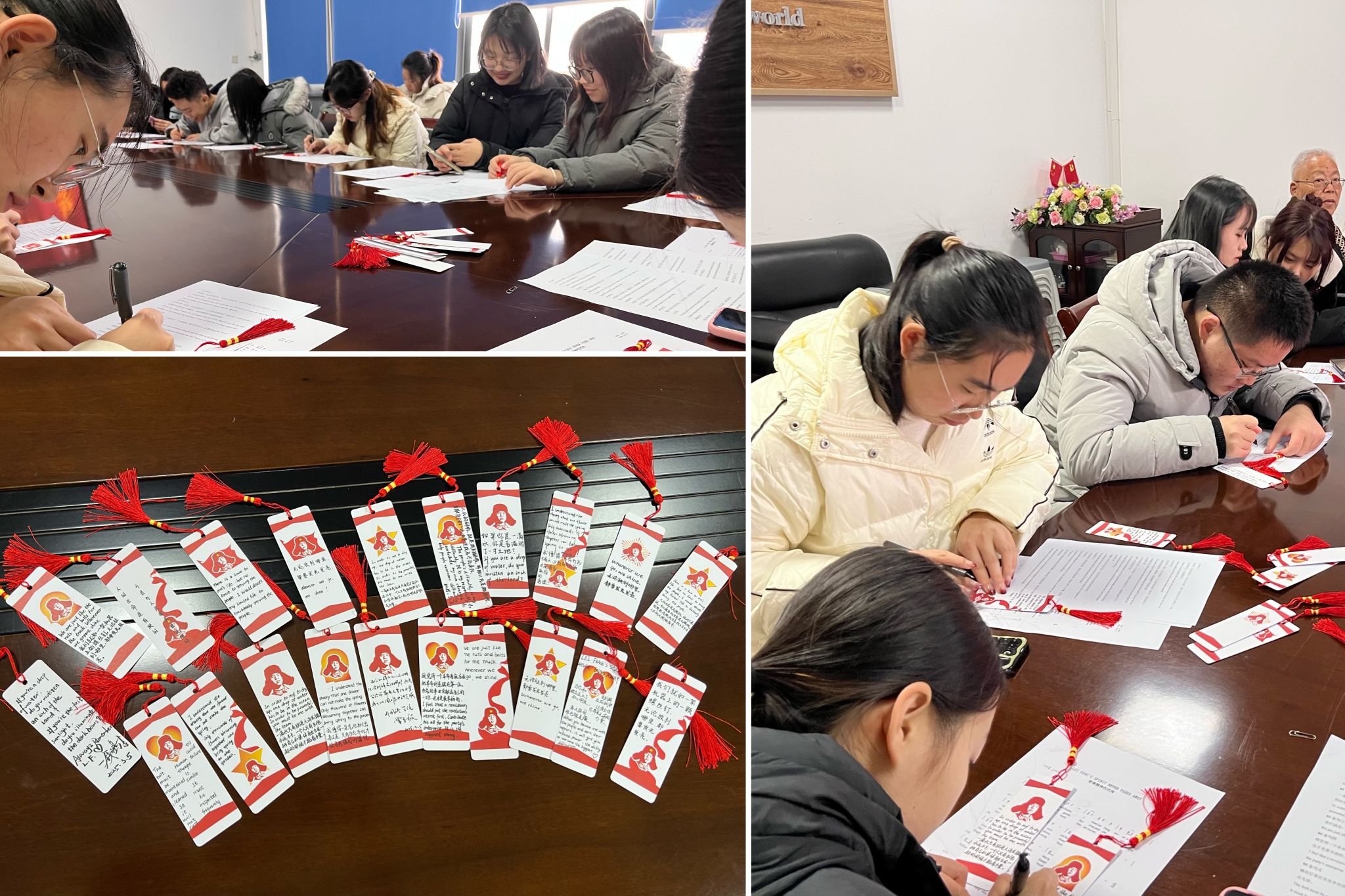 重温雷锋语录,红色书签载初心。学院关工委教师、学生党员和入党积极分子开展以“双语书写+红色文创”特色活动。师生用中英文双语誊抄雷锋经典语录并制成红色主题书签,学唱英文版《雷锋精神代代传》,以国际化语言传播红色文化。关工委老党员曹军毅寄语青年学子:“要将个人理想融入社会需求,永葆奉献初心,发扬学以致用精神,以青年话语讲好红色故事。”
