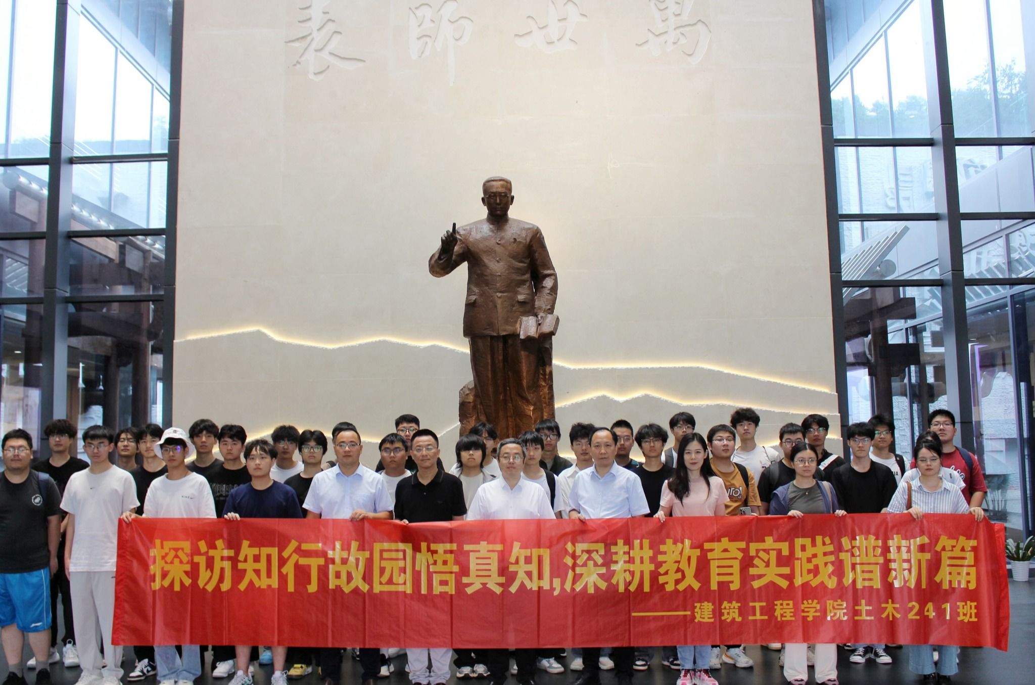 在行知纪念馆,师生通过珍贵史料与历史影像,深刻领悟先生“生活即教育”“社会即凯发”“教学做合一”的育人精髓。包永强在参观中指出,行知先生所倡导的“知行合一”理念,与建筑工程专业注重实践、服务社会的本质高度契合,希望全体学生将这份精神财富融入日常生活和学习中,在专业实践中践行真知,在服务社会中增长才干。杨涛在行知像前强调,全院教师要以行知先生为楷模,以“三进三知,三解三强”为抓手,切实深入学生课堂、宿舍、食堂,精准把握思想动态、学习难点与发展需求,构建起全员、全过程、全方位育人体系。